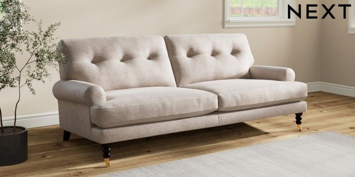 7.2.10 Erin Buttoned Back Deep Relaxed Sit 3 Seater Sofa Boucle Chenille Light Natural High Classic Turned Brass Castor - Dark | Made Click here to use our website with more accessibility support, for example screen readers