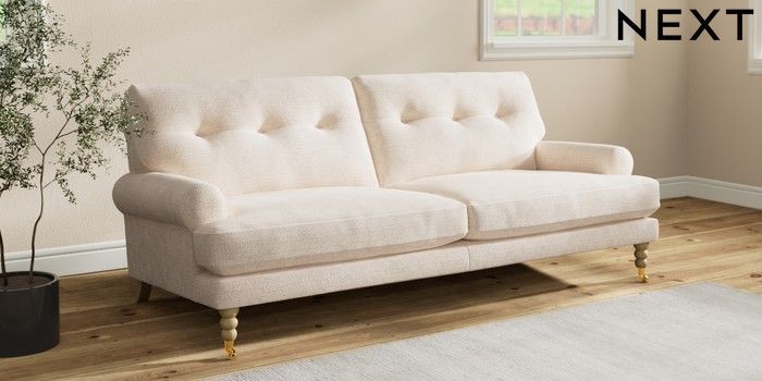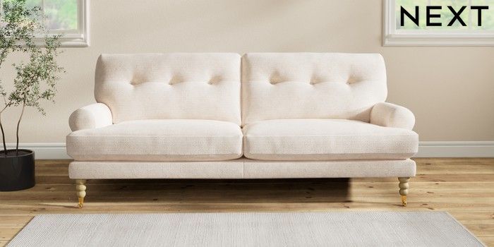 7.2.10 Erin Buttoned Back Deep Relaxed Sit 3 Seater Sofa Boucle Chenille Oyster High Classic Turned Brass Castor - Light | Made Click here to use our website with more accessibility support, for example screen readers