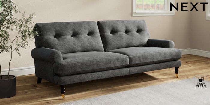 7.2.10 Erin Buttoned Back Deep Relaxed Sit 3 Seater Sofa Boucle Weave Easy Clean Charcoal Grey High Classic Turned Brass Castor - Dark | Made Click here to use our website with more accessibility support, for example screen readers