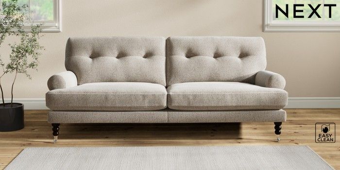 7.2.10 Erin Buttoned Back Deep Relaxed Sit 3 Seater Sofa Chunky Boucle Easy Clean Dove High Classic Turned Chrome Castor - Dark | Made Click here to use our website with more accessibility support, for example screen readers