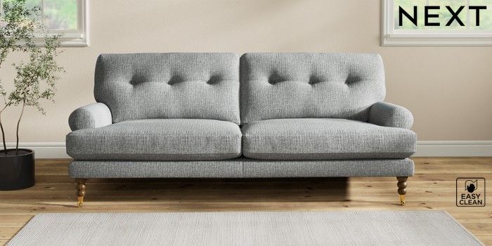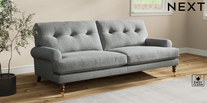 7.2.10 Erin Buttoned Back Deep Relaxed Sit 3 Seater Sofa Chunky Boucle Easy Clean Mid Grey High Classic Turned Brass Castor - Mid | Made Click here to use our website with more accessibility support, for example screen readers