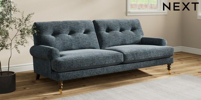 7.2.10 Erin Buttoned Back Deep Relaxed Sit 3 Seater Sofa Chunky Chenille Dark Navy Blue High Classic Turned Brass Castor - Mid | Made Click here to use our website with more accessibility support, for example screen readers