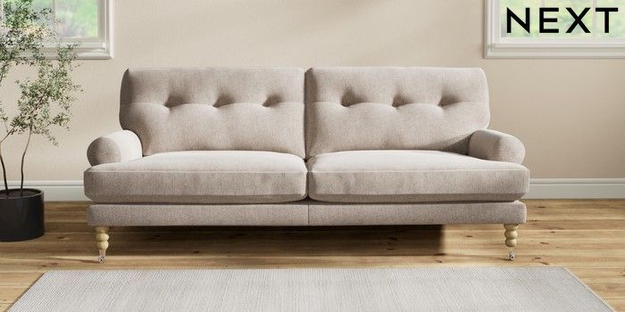 7.2.10 Erin Buttoned Back Deep Relaxed Sit 3 Seater Sofa Chunky Chenille Light Dove High Classic Turned Chrome Castor - Light | Made Click here to use our website with more accessibility support, for example screen readers