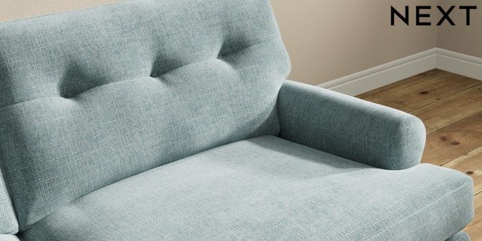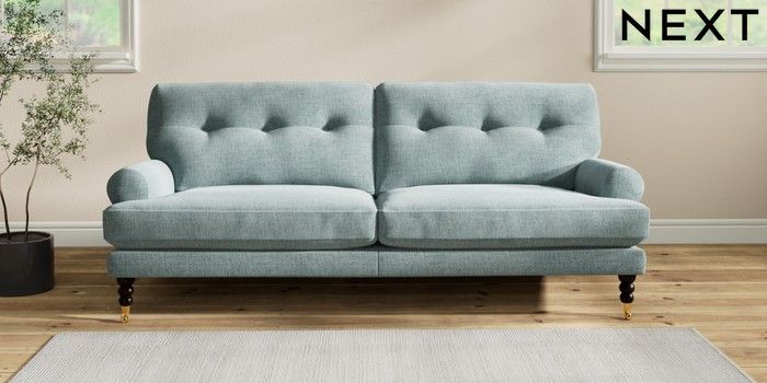 7.2.10 Erin Buttoned Back Deep Relaxed Sit 3 Seater Sofa Chunky Chenille Light Teal Green High Classic Turned Brass Castor - Dark | Made Click here to use our website with more accessibility support, for example screen readers