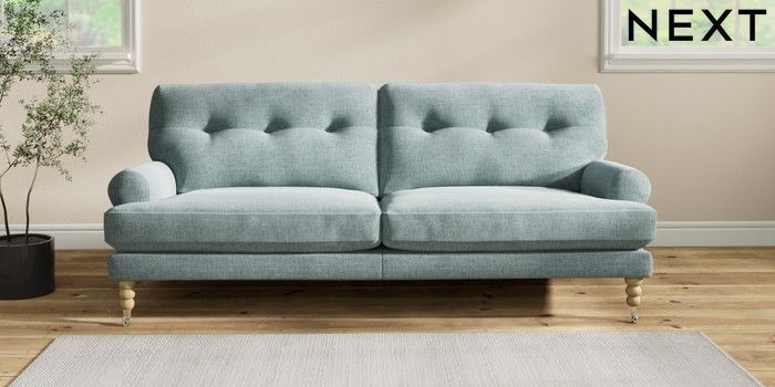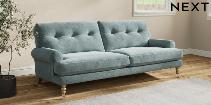 7.2.10 Erin Buttoned Back Deep Relaxed Sit 3 Seater Sofa Chunky Chenille Light Teal Green High Classic Turned Chrome Castor - Light | Made Click here to use our website with more accessibility support, for example screen readers