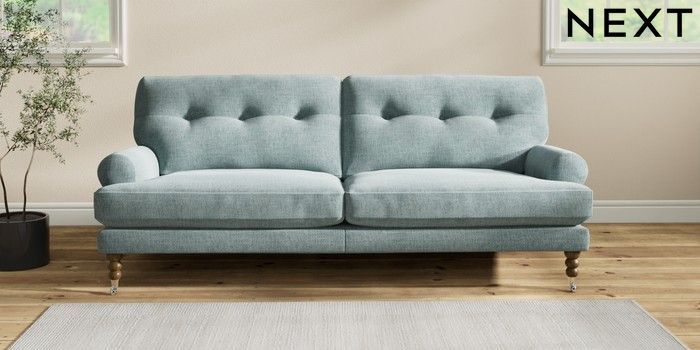 7.2.10 Erin Buttoned Back Deep Relaxed Sit 3 Seater Sofa Chunky Chenille Light Teal Green High Classic Turned Chrome Castor - Mid | Made Click here to use our website with more accessibility support, for example screen readers