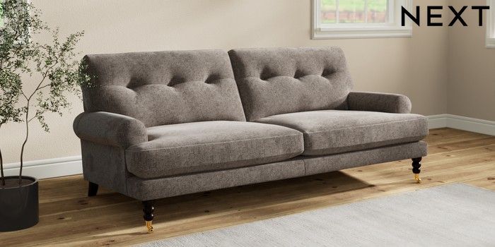 7.2.10 Erin Buttoned Back Deep Relaxed Sit 3 Seater Sofa Chunky Chenille Mink Brown High Classic Turned Brass Castor - Dark | Made Click here to use our website with more accessibility support, for example screen readers