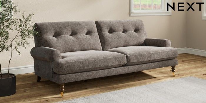 7.2.10 Erin Buttoned Back Deep Relaxed Sit 3 Seater Sofa Chunky Chenille Mink Brown High Classic Turned Brass Castor - Mid | Made Click here to use our website with more accessibility support, for example screen readers