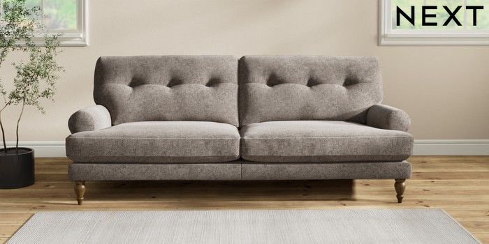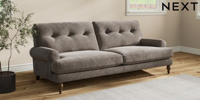 7.2.10 Erin Buttoned Back Deep Relaxed Sit 3 Seater Sofa Chunky Chenille Mink Brown High Classic Turned - Mid | Made Click here to use our website with more accessibility support, for example screen readers