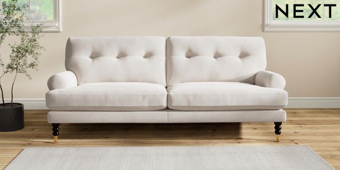 7.2.10 Erin Buttoned Back Deep Relaxed Sit 3 Seater Sofa Chunky Chenille Oyster High Classic Turned Brass Castor - Dark | Made Click here to use our website with more accessibility support, for example screen readers
