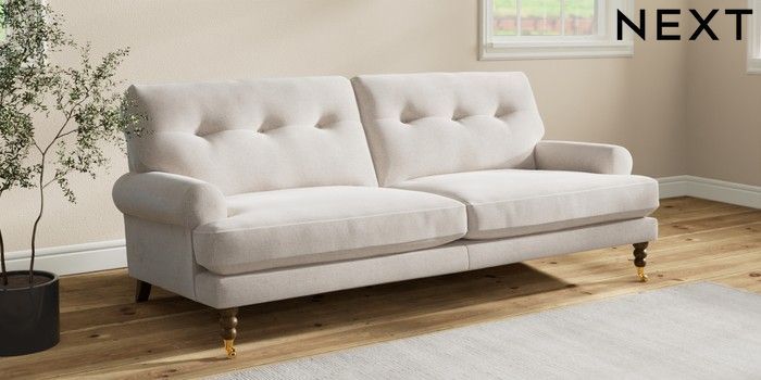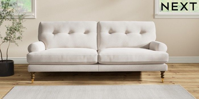 7.2.10 Erin Buttoned Back Deep Relaxed Sit 3 Seater Sofa Chunky Chenille Oyster High Classic Turned Brass Castor - Mid | Made Click here to use our website with more accessibility support, for example screen readers