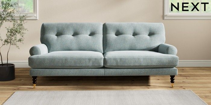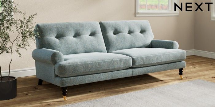 7.2.10 Erin Buttoned Back Deep Relaxed Sit 3 Seater Sofa Chunky Marl Mid Blue High Classic Turned Brass Castor - Dark | Made Click here to use our website with more accessibility support, for example screen readers