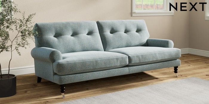 7.2.10 Erin Buttoned Back Deep Relaxed Sit 3 Seater Sofa Chunky Marl Mid Blue High Classic Turned Chrome Castor - Dark | Made Click here to use our website with more accessibility support, for example screen readers