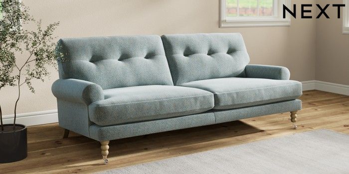 7.2.10 Erin Buttoned Back Deep Relaxed Sit 3 Seater Sofa Chunky Marl Mid Blue High Classic Turned Chrome Castor - Light | Made Click here to use our website with more accessibility support, for example screen readers