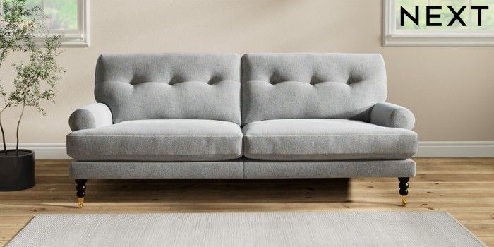 7.2.10 Erin Buttoned Back Deep Relaxed Sit 3 Seater Sofa Chunky Marl Mid Grey High Classic Turned Brass Castor - Dark | Made Click here to use our website with more accessibility support, for example screen readers