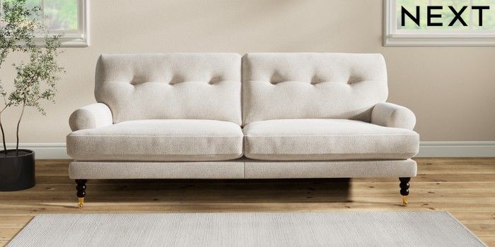 7.2.10 Erin Buttoned Back Deep Relaxed Sit 3 Seater Sofa Chunky Marl Oyster High Classic Turned Brass Castor - Dark | Made Click here to use our website with more accessibility support, for example screen readers