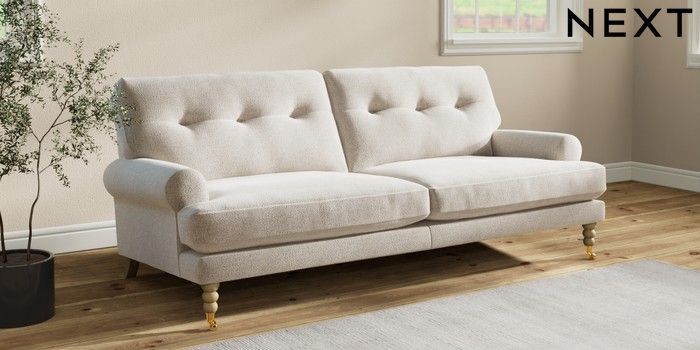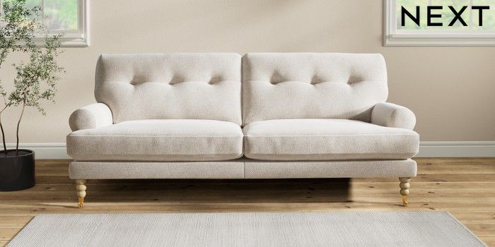 7.2.10 Erin Buttoned Back Deep Relaxed Sit 3 Seater Sofa Chunky Marl Oyster High Classic Turned Brass Castor - Light | Made Click here to use our website with more accessibility support, for example screen readers