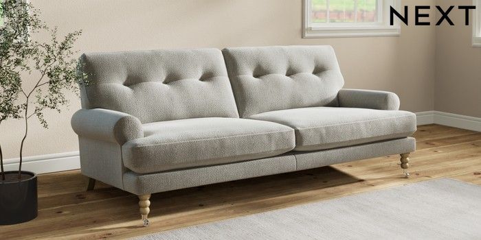 7.2.10 Erin Buttoned Back Deep Relaxed Sit 3 Seater Sofa Chunky Texture Dove High Classic Turned Chrome Castor - Light | Made Click here to use our website with more accessibility support, for example screen readers