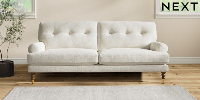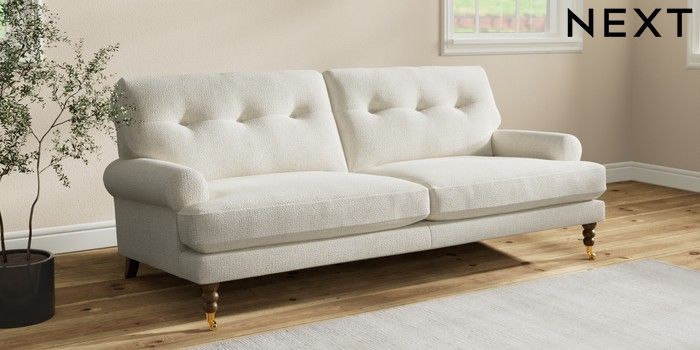 7.2.10 Erin Buttoned Back Deep Relaxed Sit 3 Seater Sofa Chunky Texture Oyster High Classic Turned Brass Castor - Mid | Made Click here to use our website with more accessibility support, for example screen readers