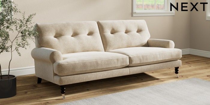 7.2.10 Erin Buttoned Back Deep Relaxed Sit 3 Seater Sofa Chunky Weave Cream High Classic Turned Chrome Castor - Dark | Made Click here to use our website with more accessibility support, for example screen readers