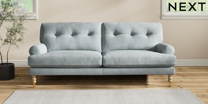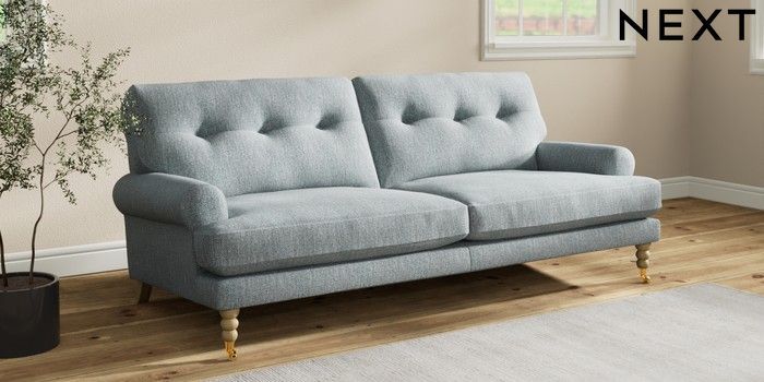 7.2.10 Erin Buttoned Back Deep Relaxed Sit 3 Seater Sofa Chunky Weave Mid Blue High Classic Turned Brass Castor - Light | Made Click here to use our website with more accessibility support, for example screen readers