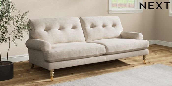 7.2.10 Erin Buttoned Back Deep Relaxed Sit 3 Seater Sofa Chunky Weave Mid Natural High Classic Turned Brass Castor - Light | Made Click here to use our website with more accessibility support, for example screen readers