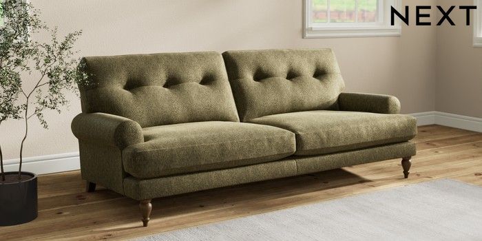 7.2.10 Erin Buttoned Back Deep Relaxed Sit 3 Seater Sofa Cotswold Chenille Dark Green High Classic Turned - Mid | Made Click here to use our website with more accessibility support, for example screen readers