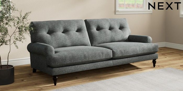 7.2.10 Erin Buttoned Back Deep Relaxed Sit 3 Seater Sofa Cotswold Chenille Dark Grey High Classic Turned - Dark | Made Click here to use our website with more accessibility support, for example screen readers