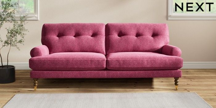 7.2.10 Erin Buttoned Back Deep Relaxed Sit 3 Seater Sofa Cotswold Chenille Dark Raspberry Pink High Classic Turned Brass Castor - Mid | Made Click here to use our website with more accessibility support, for example screen readers
