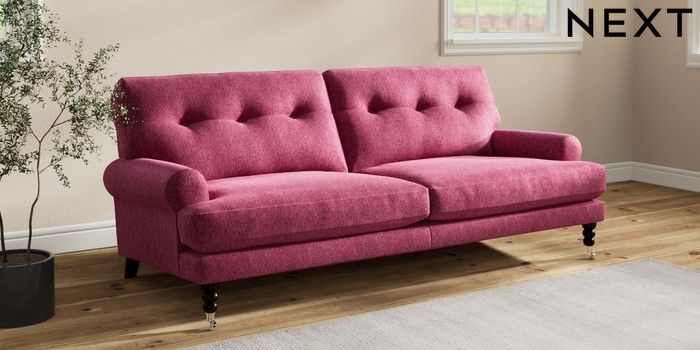 7.2.10 Erin Buttoned Back Deep Relaxed Sit 3 Seater Sofa Cotswold Chenille Dark Raspberry Pink High Classic Turned Chrome Castor - Dark | Made Click here to use our website with more accessibility support, for example screen readers