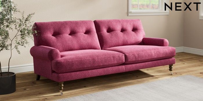 7.2.10 Erin Buttoned Back Deep Relaxed Sit 3 Seater Sofa Cotswold Chenille Dark Raspberry Pink High Classic Turned Chrome Castor - Mid | Made Click here to use our website with more accessibility support, for example screen readers