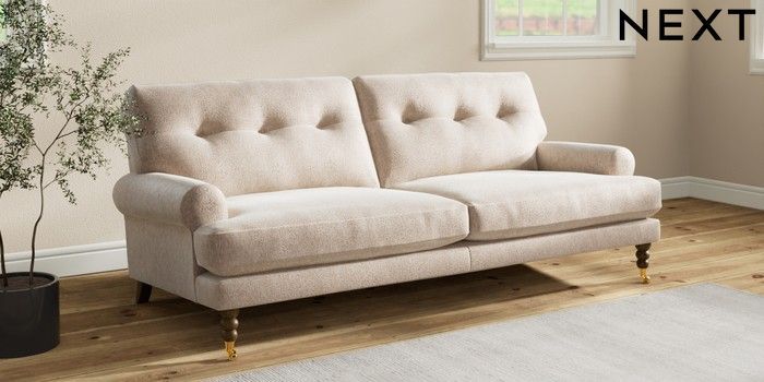 7.2.10 Erin Buttoned Back Deep Relaxed Sit 3 Seater Sofa Cotswold Chenille Light Natural High Classic Turned Brass Castor - Mid | Made Click here to use our website with more accessibility support, for example screen readers
