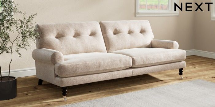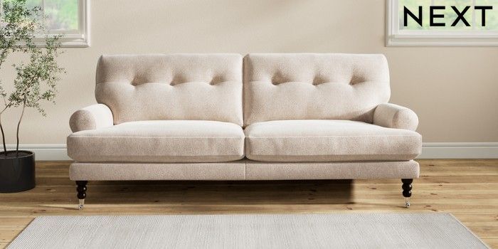 7.2.10 Erin Buttoned Back Deep Relaxed Sit 3 Seater Sofa Cotswold Chenille Light Natural High Classic Turned Chrome Castor - Dark | Made Click here to use our website with more accessibility support, for example screen readers