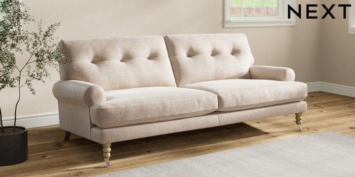 7.2.10 Erin Buttoned Back Deep Relaxed Sit 3 Seater Sofa Cotswold Chenille Light Natural High Classic Turned Chrome Castor - Light | Made Click here to use our website with more accessibility support, for example screen readers