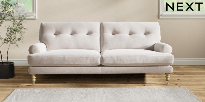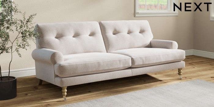 7.2.10 Erin Buttoned Back Deep Relaxed Sit 3 Seater Sofa Cotswold Chenille Oyster High Classic Turned Chrome Castor - Light | Made Click here to use our website with more accessibility support, for example screen readers