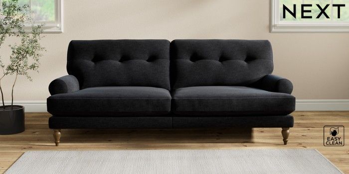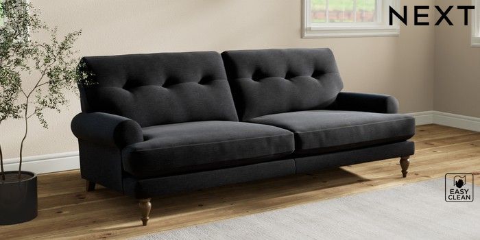 7.2.10 Erin Buttoned Back Deep Relaxed Sit 3 Seater Sofa Fine Chenille Easy Clean Black High Classic Turned - Mid | Made Click here to use our website with more accessibility support, for example screen readers