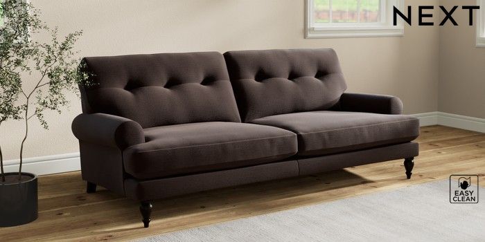 7.2.10 Erin Buttoned Back Deep Relaxed Sit 3 Seater Sofa Fine Chenille Easy Clean Chocolate Brown High Classic Turned - Dark | Made Click here to use our website with more accessibility support, for example screen readers