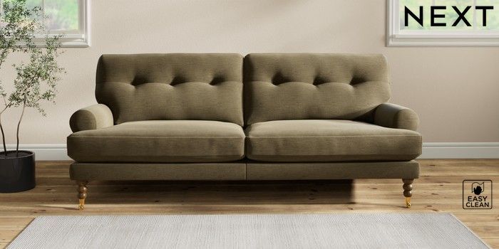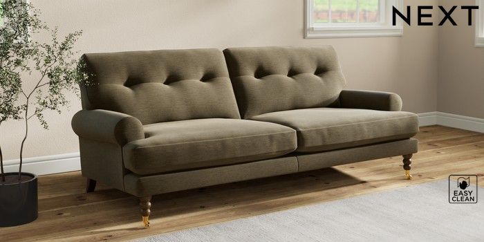 7.2.10 Erin Buttoned Back Deep Relaxed Sit 3 Seater Sofa Fine Chenille Easy Clean Dark Moss Green High Classic Turned Brass Castor - Mid | Made Click here to use our website with more accessibility support, for example screen readers