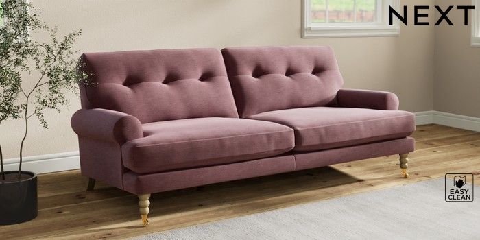 7.2.10 Erin Buttoned Back Deep Relaxed Sit 3 Seater Sofa Fine Chenille Easy Clean Mid Mulberry Purple High Classic Turned Brass Castor - Light | Made Click here to use our website with more accessibility support, for example screen readers