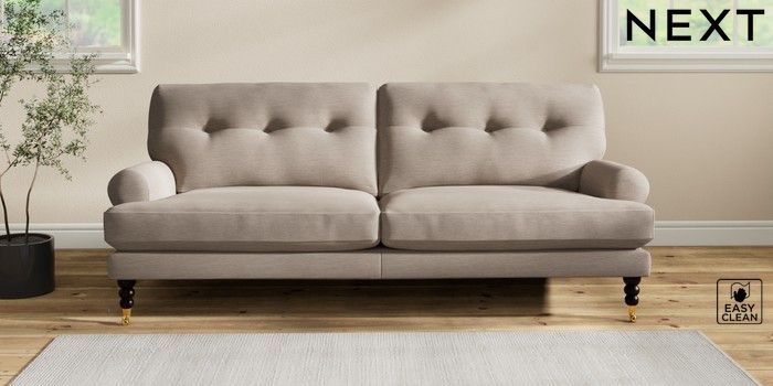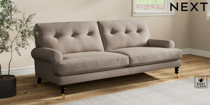 7.2.10 Erin Buttoned Back Deep Relaxed Sit 3 Seater Sofa Fine Chenille Easy Clean Mid Taupe Brown High Classic Turned Brass Castor - Dark | Made Click here to use our website with more accessibility support, for example screen readers