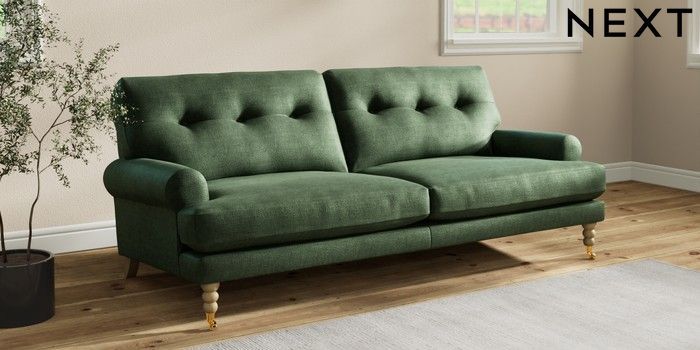 7.2.10 Erin Buttoned Back Deep Relaxed Sit 3 Seater Sofa Luxe Chenille Dark Green High Classic Turned Brass Castor - Light | Made Click here to use our website with more accessibility support, for example screen readers