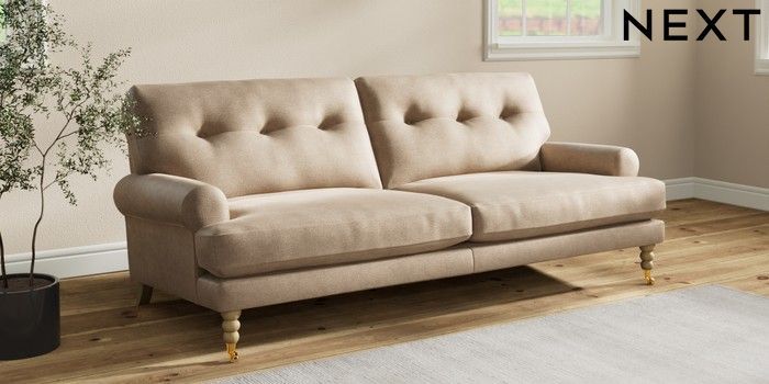 7.2.10 Erin Buttoned Back Deep Relaxed Sit 3 Seater Sofa Luxe Chenille Mid Camel Beige High Classic Turned Brass Castor - Light | Made Click here to use our website with more accessibility support, for example screen readers