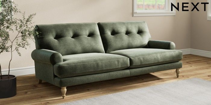 7.2.10 Erin Buttoned Back Deep Relaxed Sit 3 Seater Sofa Luxe Chenille Mid Green High Classic Turned - Light | Made Click here to use our website with more accessibility support, for example screen readers