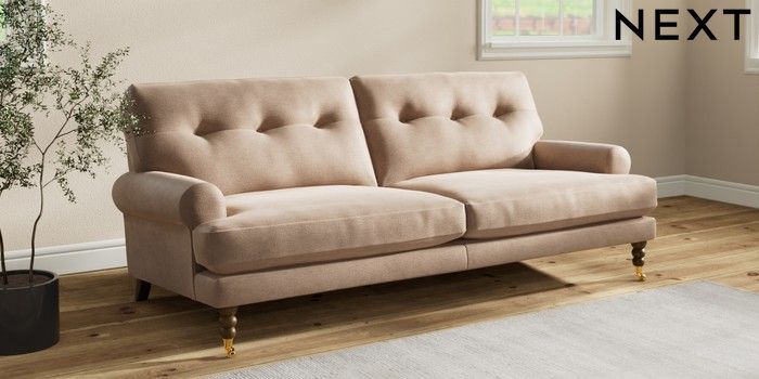 7.2.10 Erin Buttoned Back Deep Relaxed Sit 3 Seater Sofa Luxe Chenille Mid Natural High Classic Turned Brass Castor - Mid | Made Click here to use our website with more accessibility support, for example screen readers