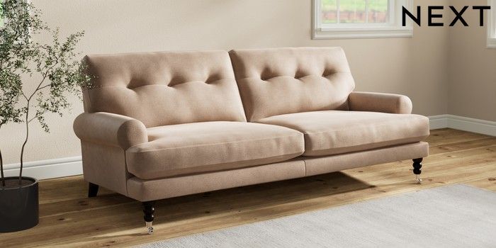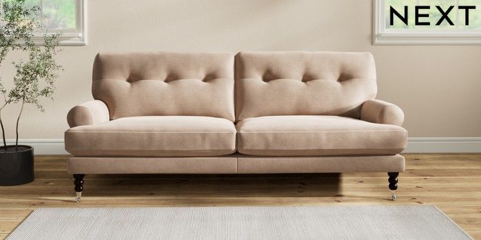 7.2.10 Erin Buttoned Back Deep Relaxed Sit 3 Seater Sofa Luxe Chenille Mid Natural High Classic Turned Chrome Castor - Dark | Made Click here to use our website with more accessibility support, for example screen readers