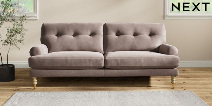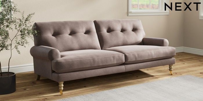 7.2.10 Erin Buttoned Back Deep Relaxed Sit 3 Seater Sofa Luxe Chenille Mink Brown High Classic Turned Brass Castor - Light | Made Click here to use our website with more accessibility support, for example screen readers