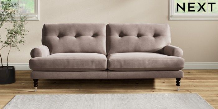 7.2.10 Erin Buttoned Back Deep Relaxed Sit 3 Seater Sofa Luxe Chenille Mink Brown High Classic Turned Chrome Castor - Dark | Made Click here to use our website with more accessibility support, for example screen readers