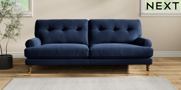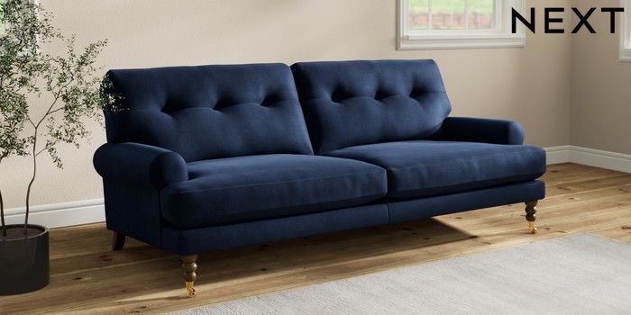 7.2.10 Erin Buttoned Back Deep Relaxed Sit 3 Seater Sofa Luxe Chenille Navy Blue High Classic Turned Brass Castor - Mid | Made Click here to use our website with more accessibility support, for example screen readers