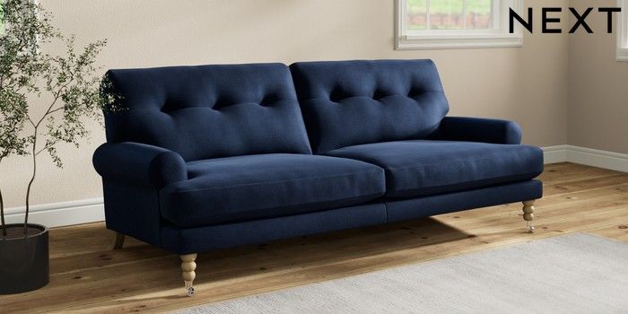 7.2.10 Erin Buttoned Back Deep Relaxed Sit 3 Seater Sofa Luxe Chenille Navy Blue High Classic Turned Chrome Castor - Light | Made Click here to use our website with more accessibility support, for example screen readers