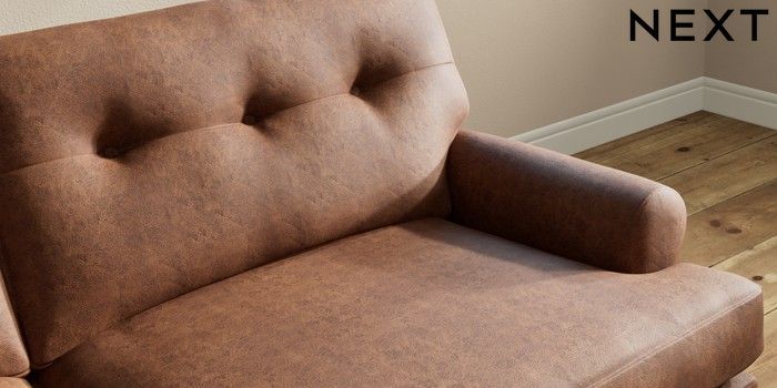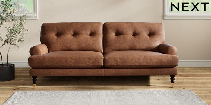 7.2.10 Erin Buttoned Back Deep Relaxed Sit 3 Seater Sofa Monza Faux Leather Easy Clean Chestnut Brown High Classic Turned Brass Castor - Dark | Made Click here to use our website with more accessibility support, for example screen readers